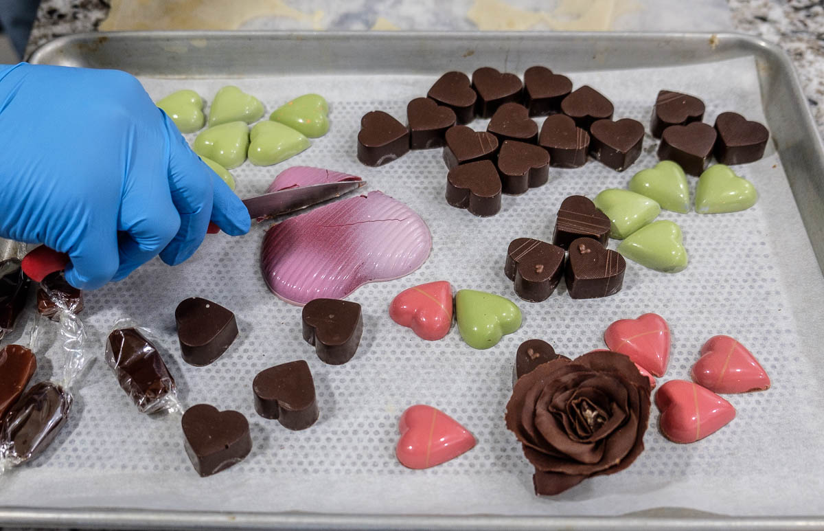 I got a sample of that during my visit this week, when Muñoz displayed a tray of shining pink, green and chocolate heart-shaped Valentine’s Day chocolates with playful names and exotic ingredients. There were My Main Squeeze, Apple of My Eye, Love Bombing and Ispahan, the big piece de resistance with “lychee and rose jelly, rose almond marzipan, rosemary milk chocolate ganache and raspberry inspiration chocolate.” The chocolates were being packaged in ribbon-tied transparent boxes, ready to give recipients a tastebud workout on Feb. 14.